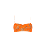Top de bikini estilo bustier con varillas que ofrecen soporte al busto y broche de metal dorado en la espalda. Estampado con un diseño original de Aguaclara, confeccionado en Perú con tela italiana.