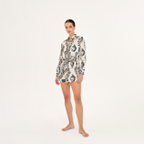 Camisa clásica diseñada con mangas largas, bolsillo tipo parche y cierre de botones al frente. Pieza estampada con un diseño exclusivo de Aguaclara, confeccionada en Perú con tela italiana.
