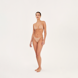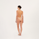 Calzón de bikini con tiras ajustables que se anudan a los lados, confeccionado en fino encaje bordado exclusivo de Aguaclara. Corte Brasilero y elastico corrugado en espalda. Cuenta con delicados accesorios metálicos dorados en las puntas. Pieza de fino encaje bordado exclusivo de Aguaclara, confeccionada en Perú con tela italiana.