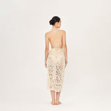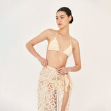 Falda estilo pareo que se amarra en cintura. Pieza de fino encaje bordado exclusivo de Aguaclara, confeccionada en Perú con tela italiana.