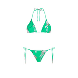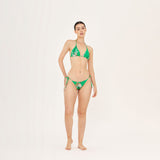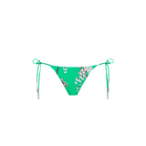 Calzón de bikini con tiras ajustables que se anudan a los lados, confeccionado en fino encaje bordado exclusivo de Aguaclara. Corte Brasilero y elastico corrugado en espalda. Cuenta con delicados accesorios metálicos dorados en las puntas. Pieza estampada con un diseño original de Aguaclara, confeccionada en Perú con tela italiana.