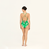 Traje de baño clásico con escote en V y detalle de cintas regulables en espalda. Pieza estampada con diseño original de Aguaclara, confeccionada en Perú con tela italiana.