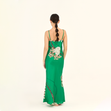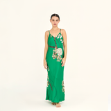 Vestido con escote en V y tirantes ajustables. Pieza estampada con diseño original de Aguaclara, confeccionada en Perú con tela italiana.