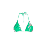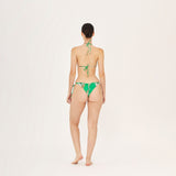 Clásico top de bikini triangular con tirantes ajustables que se anudan en cuello y espalda, adornado con detalles metálicos dorados en las puntas. Pieza estampada con un diseño original de Aguaclara, confeccionada en Perú con tela italiana.