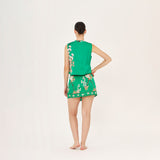 Blusa diseñada con cruce asimetrico, detalle de lazos y cuello neru. Pieza estampada con diseño original de Aguaclara, confeccionada en Perú con tela italiana.