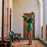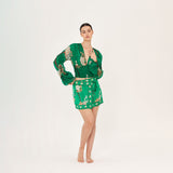Blusa diseñado con escote profundo, elástico en cintura y mangas abullonadas. Pieza estampada con un diseño original de Aguaclara, confeccionada en Perú con tela italiana.