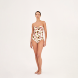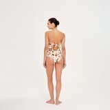 Traje de baño strapless con detalle central en forma de U en metal dorado, lazo para amarre en la espalda y tirante removible al cuello. Pieza estampada con un diseño original de Aguaclara, confeccionada en Perú con tela italiana.