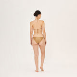 Calzón de bikini con tiras ajustables que se anudan a los lados, con accesorios metálicos dorados en las puntas. Pieza en original tela satinada exclusiva de Aguaclara, confeccionada en Perú con tela italiana.