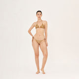 Clásico top de bikini de triángulo corredizo, diseñado con tirantes que se amarran al cuello y la espalda. Decorado con una aplicación de palmera bordada en lentejuelas doradas y delicados detalles de accesorios metálicos dorados en las puntas. Pieza en original tela satinada exclusiva de Aguaclara, confeccionada en Perú con tela italiana.