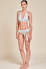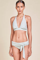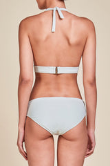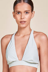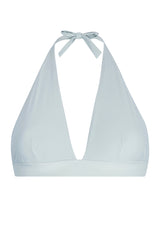 Lindo top Halter en color aqua suave. Tiene una banda elastica debajo del busto para mayor soporte. Copas removibles, amarra al cuello y con broche metalico en espalda. Todo forrado. Tela Italiana, Hecho en Peru. <[@[ESP DESCRIP OR]]br>Composicion: