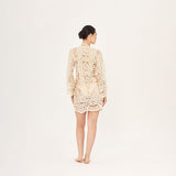 Vestido estilo bata diseñado con mangas 3/4 y se amarra en la parte delantera. Pieza de fino encaje bordado exclusivo de Aguaclara, confeccionada en Perú con tela italiana.