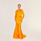 Falda sirena Papaya, una pieza unica en este color original de Aguaclara. Falda 100% Seda Satin Italiana.