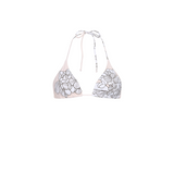 Top Triángulo Corredizo Hortense, en dibujo original de Aguaclara. Top de Tela Italiana con accesorios de metal dorado en tiritas.