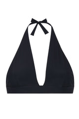 Lindo halter negro. Hecho en la más fina tela italiana SENSITIVE de un tacto delicioso y siguiendo los estándares más altos de sostenibilidad. Tiene un elástico debajo del busto para mayor soporte. Copas removibles. Amarra al cuello y tiene broche metálico dorado en la espalda. Todo forrado.