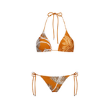 Top Triángulo Corredizo Villa Orange, en dibujo original de Aguaclara. Top de Tela Italiana con accesorios de metal dorado en tiritas.