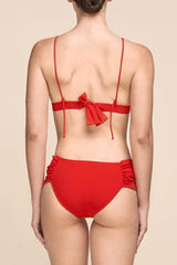 Tiene una estructura interna de calzon clasico, y unos cortes con aplicaciones de tela recogida a los lados, para afinar la silueta en la parte de las caderas.