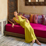 Vestido halter diseñado con escote profundo a la cintura y espalda descubierta. Pieza en sutil brillo, confeccionada en Perú con tela italiana.