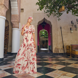 Vestido largo con cuello alto y elástico en cuello y cintura, mangas cortas abullonadas y cierre de botones al frente. Pieza estampada con un diseño exclusivo de Aguaclara, confeccionada en Perú con tela italiana.